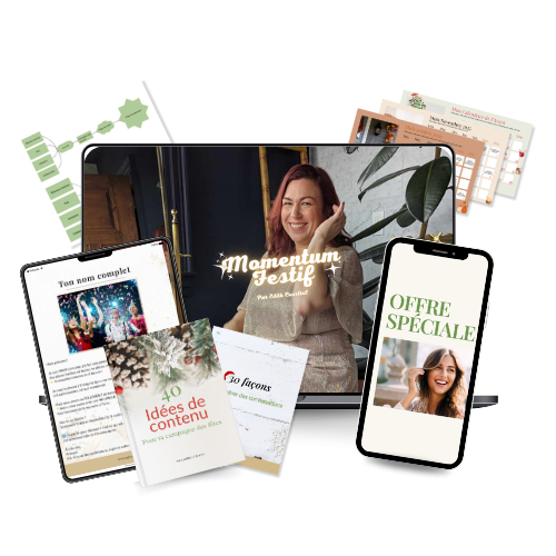 Si tu veux arriver dans le rush des Fêtes avec une stratégie déjà prête, un message clair et des visuels cohérents, c’est maintenant qu’il faut t’y mettre. Et si tu veux un coup de main pour bâtir cette structure sans tout recommencer à zéro, mon guide Momentum Festif a été créé pour ça. Tu y trouveras une méthode complète pour planifier ta campagne de fin d’année : modèles de courriels, calendrier stratégique, idées de contenus et plan pas à pas pour vendre sans t’épuiser.